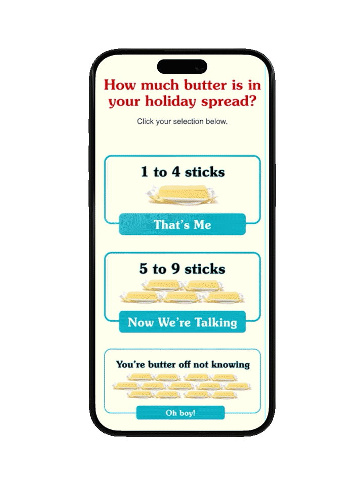 In a season steeped in tradition, Response Media helped Horizon Organic cut through the holiday clutter with a campaign as smart as it was simple. By turning a humble stick of butter into a catalyst for conversation and connection, we transformed passive audiences into active participants—and reminded consumers that Horizon belongs at the heart of their holiday table. Grounded in a timely, consumer-first idea and executed with strategic precision, the campaign delivered standout engagement, a seamless multichannel experience, and ultimately exceeded client expectations.